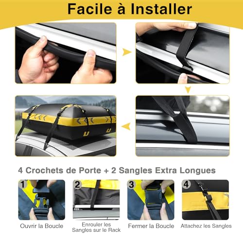 Le pack est très complet ! Vous recevrez : 1 sac de toit de 425L, 1 tapis antidérapant pour protéger votre toit et éviter que le sac ne glisse, 1 sac de rangement pour le coffre une fois plié, 1 cadenas à combinaison, 6 crochets de porte, et 2 sangles renforcées.