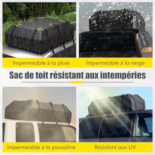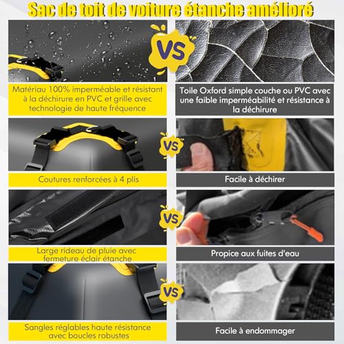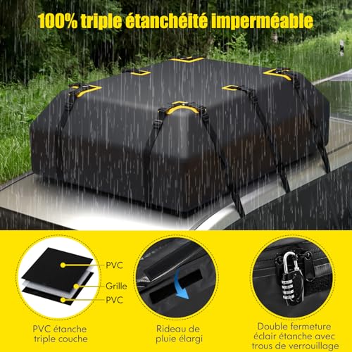 Oui, ce coffre de toit étanche est fabriqué avec un tissu en polyester durable doté d’un revêtement en PVC triple épaisseur. De plus, il est équipé de doubles fermetures éclair étanches et d’un rideau de pluie intégré avec des attaches auto-agrippantes pour une protection renforcée contre la pluie, la neige, la poussière et les autres intempéries.