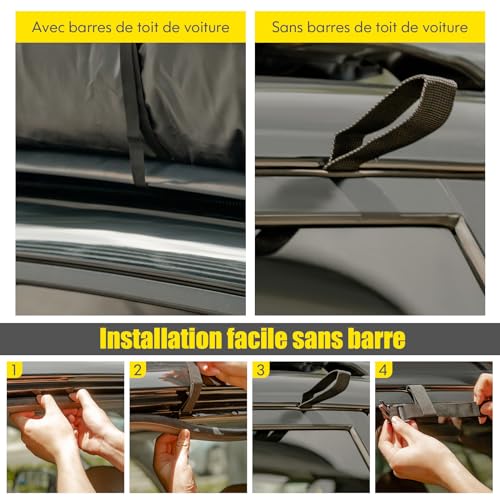 Non, l’installation de ce coffre de toit facile à installer est conçue pour être simple et rapide. Pour les véhicules sans barres de toit, il suffit de fixer les crochets de porte aux encadrements. Pour ceux qui en sont équipés, les sangles robustes et réglables permettent une fixation sûre et stable autour des barres de toit. Des étapes d’installation claires sont fournies pour vous guider.