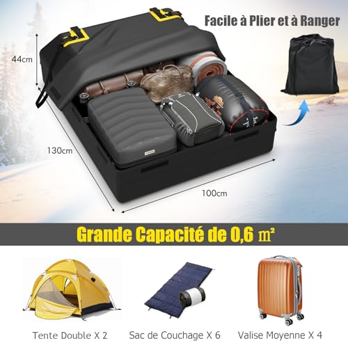 Avec une capacité de stockage impressionnante de 600 litres, ce coffre de toit vous offre une liberté totale pour emporter tout ce dont vous avez besoin pour vos aventures. Que ce soit du matériel de camping pour toute la famille, des équipements sportifs volumineux, ou tout simplement des bagages supplémentaires, vous n’aurez plus à faire de compromis sur ce que vous emportez. Le coffre de toit COSTWAY est la solution idéale pour maximiser l’espace de votre véhicule et voyager l’esprit léger, en sachant que tout votre équipement est transporté en toute sécurité et protégé des éléments.