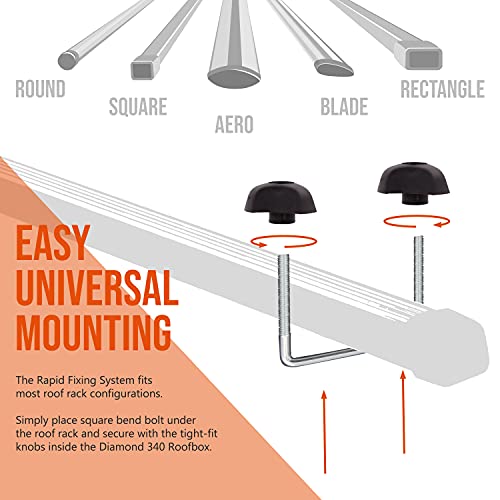 Le Diamond 340 est compatible avec la plupart des barres de toit standards. Veillez à vérifier les dimensions et le poids maximal supporté par vos barres avant l’achat.